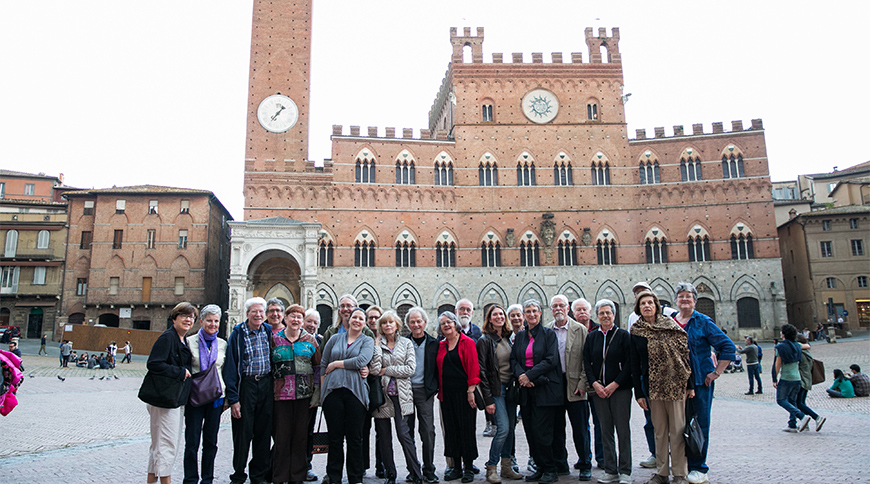Walking up to 5 miles throughout the day with periods of standing during site visits; cobblestones, mostly level urban stone sidewalks, pedestrian-only roads with inclines and descents, and stairs to/from the main piazza. Elevator is available in the Palazzo Pubblico. Extent and duration of walking and other activities during free time according to personal choice.